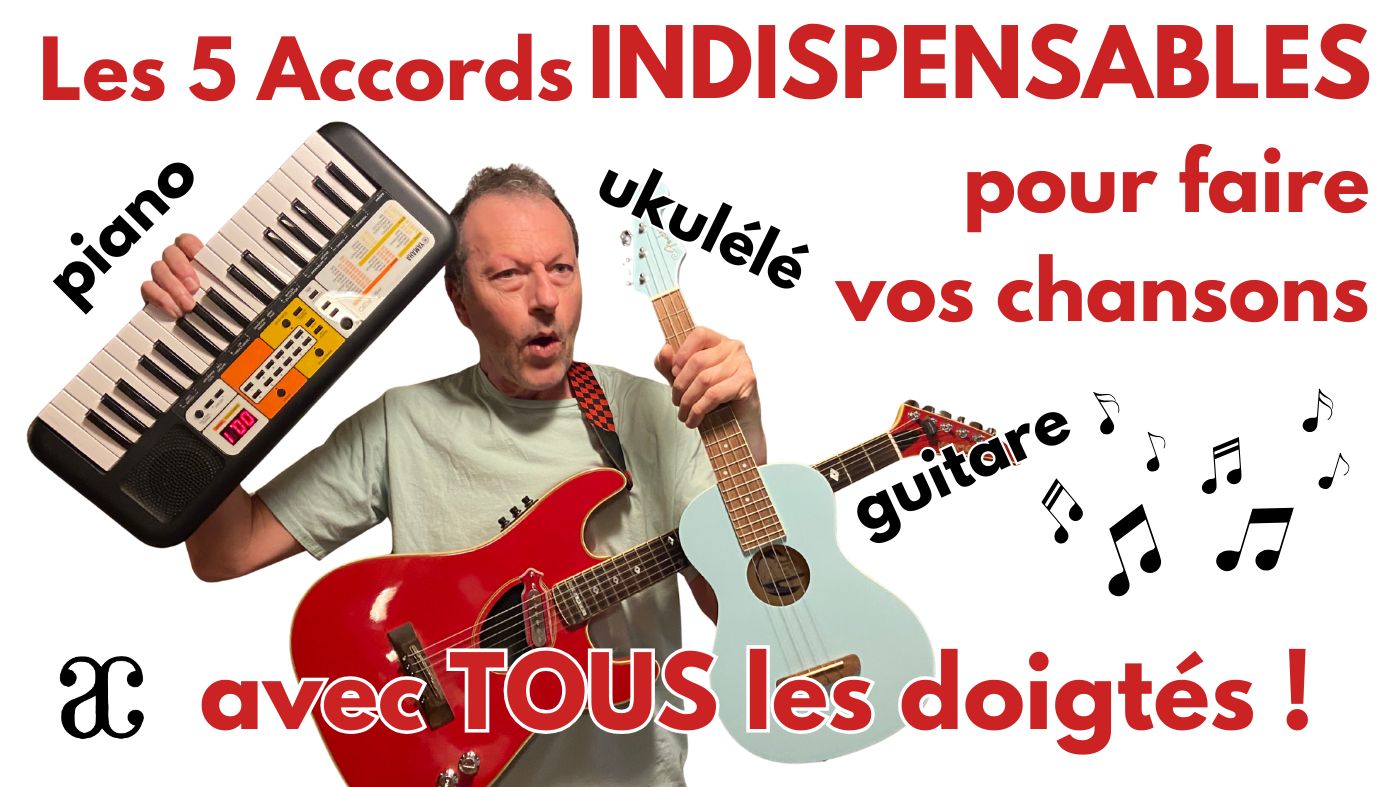 Aujourd’hui, on va droit au but : quels sont les 5 accords indispensables pour composer des chansons ? Le 5 plus utilisés, mais aussi les plus faciles à jouer ?